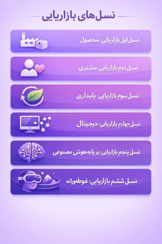 با گذر از نسل پنجم، بازاریابی اکنون وارد عصری نوشده است، عصری که نسل ششم بازاریابی نامیده میشود و برتجربه چندحسی متکی است. و تمرکز خود را بر غوطهوری، تفسیر معنا و مشارکت فعال مخاطب میگذارد. با نگاهی گذرا به ۵ نسل طی شده وارد نسلی میشویم که زیست ما در آن در جریان است.