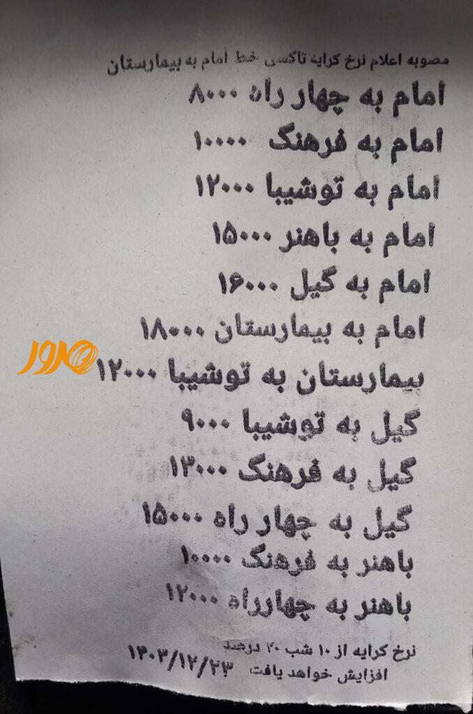 در نبود الزام نصب برچسب دیجیتالی نرخ کرایه، برخی رانندگان برگهای به شیشه یا داشبورد خودرو خود چسباندهاند، که البته فاقد مهر و امضاست، و نشان میدهد در تاریخ ۲۳ اسفند ۱۴۰۳ یکبار نرخ کرایه افزایش یافته است