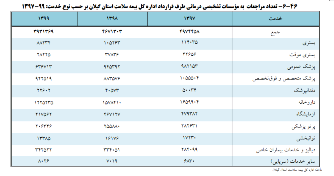 رکود اقتصادی، افزایش هزینههای جاری در بخش بهداشت و درمان و حذف سوبسیدهای بیمهها باعث شده تا بر اساس آمارها و اطلاعات اداره کل بیمه سلامت استان گیلان، تعداد افراد مراجعهکننده به مراکز درمانی استان در فاصلهی سالهای ۹۷ تا ۹۹ به طور معناداری کاهش یابد.