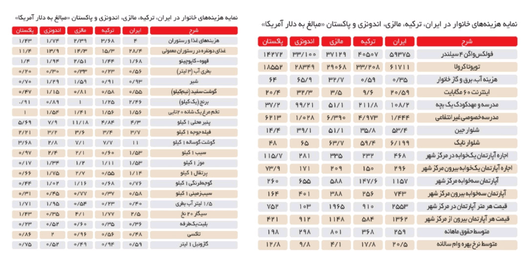 در یادداشتی که در روزنامهی شرق منتشر شده، ایران در میان چهار کشور آسیایی پاکستان، ترکیه، اندونزی و مالزی گرانترین کشور برای زندگی است. این آمارها نشان میدهند میزان هزینهای که اعضای یک خانوار باید برای تامین نیازهای زندگی خرج کنند، در مورد بسیاری از اقلام از هر ۴ کشور بیشتر است.