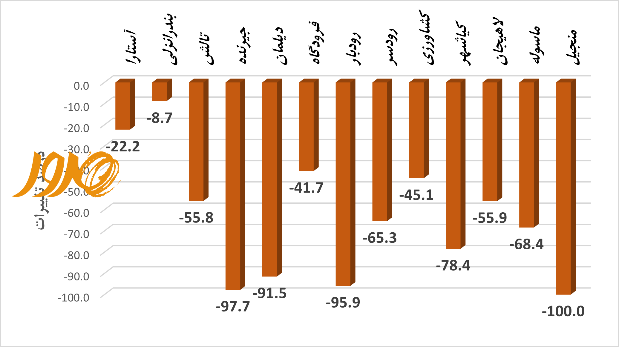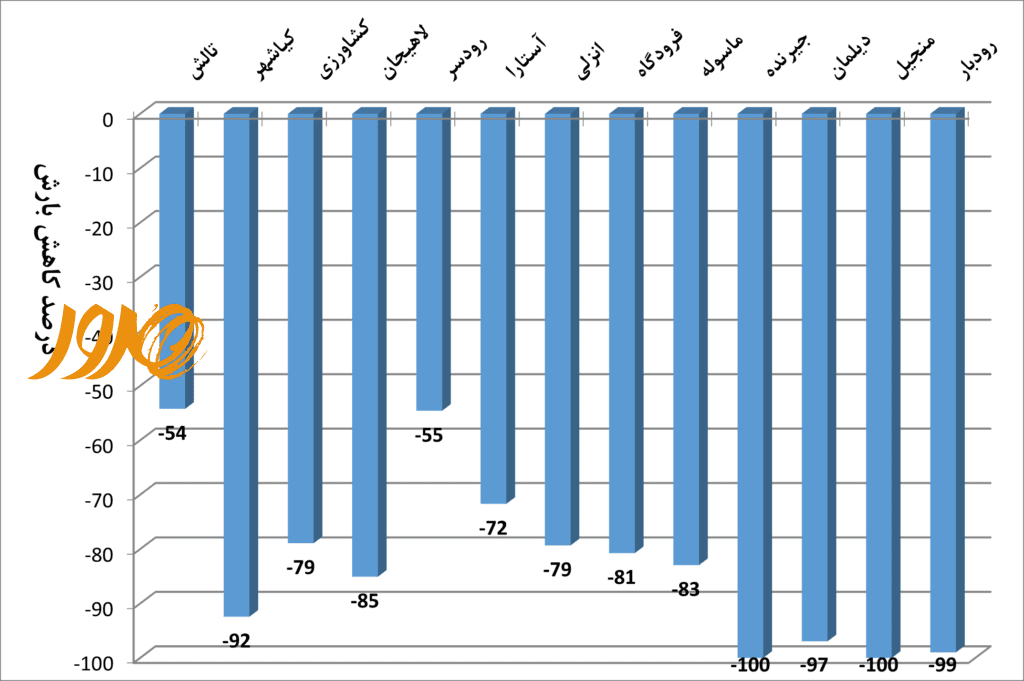 به تفکیک در ماه آبان در جلگه مرکزی گیلان با کاهش 83درصدی بارش مواجه بوده است. در جلگه غربی کاهش بارش 65 درصد و جلگه شرقی 70 درصد بوده است، و در کوهستانهای گیلان، کاهش بارش به عدد 93 درصد رسیده است.