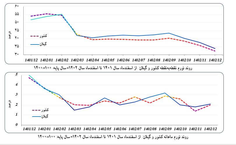 لازم به ذکر است؛ نرخ تورم گیلان در بهمن ماه سال ۱۴۰۲، معادل ۴۳.۹ درصد اعلام شده بود که تغییرات ماهانه شاخص قیمت بهمن ماه در استان برابر ۱.۸درصد بود. همچنین نرخ تورم نقطهبهنقطه در بهمن ماه برابر ۳۷.۷ درصد بود که در اسفند به ۳۳.۸ رسید.