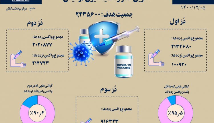 وی تاکید کرد: تزریق دُز سوم واکسن کرونا نیز در گیلان به ۹۱۶ هزار و ۳۲۳ نفر رسید که ۴۱ درصد از جامعه هدف این استان را به خود اختصاص داده است.