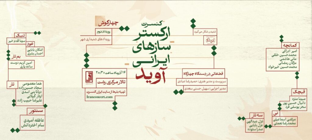 کنسرت «ارکستر سازهای ایرانی آوید»، شامگاه جمعه ۱۴ آذرماه، ساعت ۲۰:۳۰، در سالن اصلی تالار مرکزی رشت برگزار شد و با استقبال علاقهمندان به موسیقی سنتی و سازهای ایرانی همراه بود.