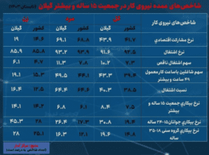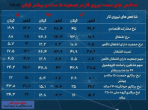 دومین جدول نیز نرخ بیکاری و برخی شاخصهای اقتصادی مرتبط را در کل کشور و در گیلان در تابستان ۱۴۰۳ منعکس میکند.