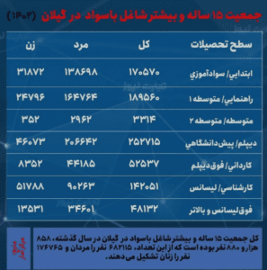 در عین حال، سهم زنان از جمعیت غیرفعال باسواد در گیلان به حدود ۷۲ درصد میرسد. آمارها این نسبت را در کل کشور نیز حدود ۷۲ درصد نشان میدهند. از سویی حدود ۲۰ درصد از این جمعیت نیز فارغالتحصیل دانشگاه هستند؛ گزارش مرکز آمار نشان میدهد این نسبت در کل کشور به حدود ۲۱ درصد میرسد.