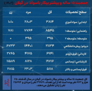 کل جمعیت ۱۵ ساله و بیشتر بیکار باسواد در گیلان در سال گذشته، ۶۵ هزار و ۶۶۳ نفر بوده است که از این تعداد، ۳۹ هزار و ۹۶۹ نفر را مردان و ۲۵ هزار و ۶۹۴ نفر را زنان تشکیل میدهند.
