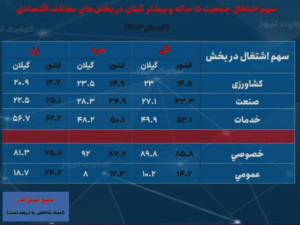 در این میان، سهم بخش کشاورزی از اشتغال گیلان بیشتر از متوسط کشوری و سهم خدمات و صنعت کمتر است. این وضعیت در هر سه گروه کل، مردان و زنان صدق میکند.