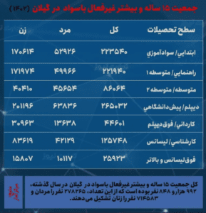 کل جمعیت ۱۵ ساله و بیشتر غیرفعال باسواد در گیلان در سال گذشته، ۹۹۲ هزار و ۸۴۸ نفر بوده است که از این تعداد، ۲۷۸ هزار و ۲۶۵ نفر را مردان و ۷۱۴ هزار و ۵۸۳ نفر را زنان تشکیل میدهند.