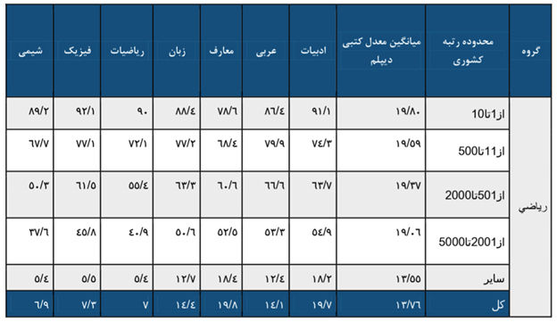 اگر بخواهیم به زبان آشناتری این واقعیت را بیان کنیم، مثل این است که همان امتحانات معمولی ۲۰ نمرهای در دروس فارسی و دینی، عربی و انگلیسی از دانشآموزان یک کلاس گرفته شده باشد و اکثر دانشآموزان آن کلاس به زحمت نمرهی ۴ یا ۵ آورده باشند. و مجددا همان کلاس در امتحانات دروس جبر، حساب، هندسه، فیزیک و شیمی، به زحمت نمرهی ۱ از بیست را کسب کرده باشند! (شکل زیر به عنوان نمونه، میانگین نمرات را در بازههای مختلف رتبهای به انضمام میانگین کل در دروس مختلف در زیرگروه ریاضی نشان میدهد)